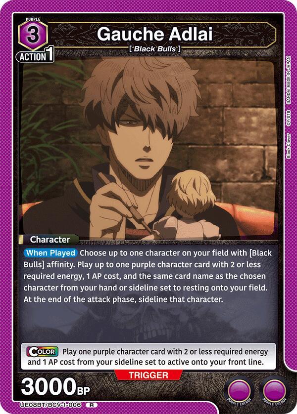 [When Played] Choose up to one character on your field with [Black Bulls] affinity. Play up to one purple character card with 2 or less required energy, 1 AP cost, and the same card name as the chosen character from your hand or sideline set to resting onto your field. At the end of the attack phase, sideline that character.