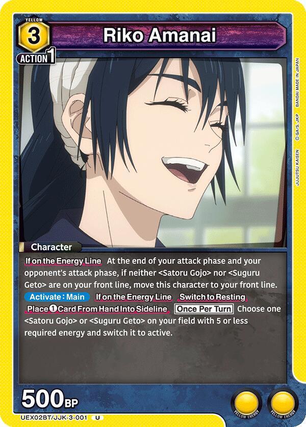 [Activate: Main] (If on the Energy Line) (Switch to Resting) (Place (1) Card From Hand Into Sideline) [Once Per Turn] Choose one "Satoru Gojo" or "Suguru Geto" on your field with 5 or less required energy and switch it to active.