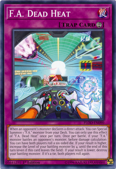 When an opponent's monster declares a direct attack: You can Special Summon 1 "F.A." monster from your Deck. You can only use this effect of "F.A. Dead Heat" once per turn. Once per battle, if your "F.A." monster battles an opponent's monster, before damage calculation: You can have both players roll a six-sided die. If your result is higher, increase the Level of your battling monster by 4, until the end of this turn (even if this card leaves the field). If your result is lower, destroy your battling monster. If it's a tie, both players roll again.