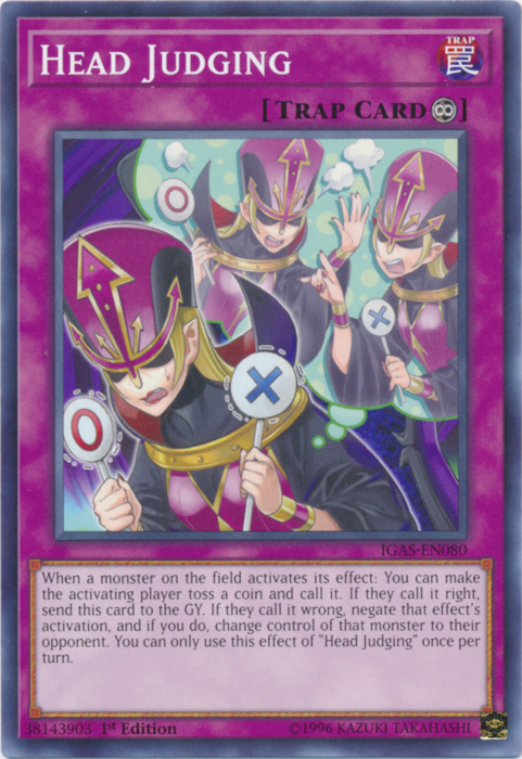 When a monster on the field activates its effect: You can make the activating player toss a coin and call it. If they call it right, send this card to the GY. If they call it wrong, negate that effect's activation, and if you do, change control of that monster to their opponent. You can only use this effect of "Head Judging" once per turn.