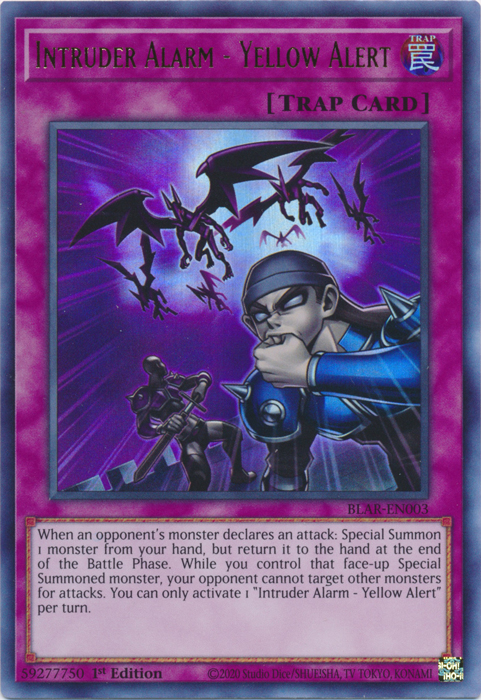 When an opponent's monster declares an attack: Special Summon 1 monster from your hand, but return it to the hand at the end of the Battle Phase. While you control that face-up Special Summoned monster, your opponent cannot target other monsters for attacks. You can only activate 1 "Intruder Alarm - Yellow Alert" per turn.