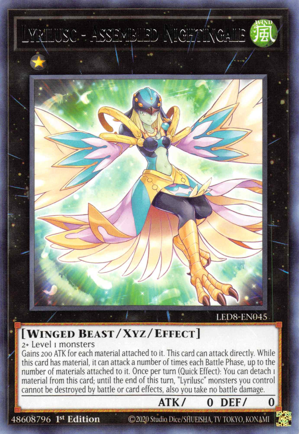 This card gains 200 ATK for each Xyz Material attached to it. This card can attack directly. While this card has Xyz Material, it can attack a number of times each Battle Phase, up to the number of Xyz Materials attached to it. Once per turn, during either player's turn: You can detach 1 Xyz Material from this card; until the end of this turn, "Lyrilusc" monsters you control cannot be destroyed by battle or card effects, also you take no battle damage.