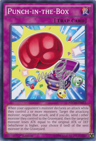 When your opponent's monster declares an attack while they control 2 or more monsters: Target the attacking monster; negate that attack, and if your do, send 1 other monster they control to the Graveyard, then the targeted monster loses ATK equal to the original ATK or DEF (whichever is higher, your choice if tied) of the sent monster in the Graveyard.