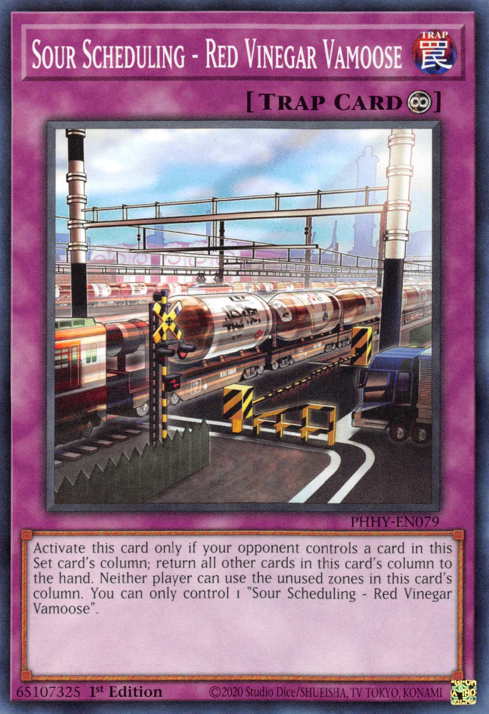 Activate this card only if your opponent controls a card in this Set card's column; return all other cards in this card's column to the hand. Neither player can use the unused zones in this card's column. You can only control 1 "Sour Scheduling - Red Vinegar Vamoose".